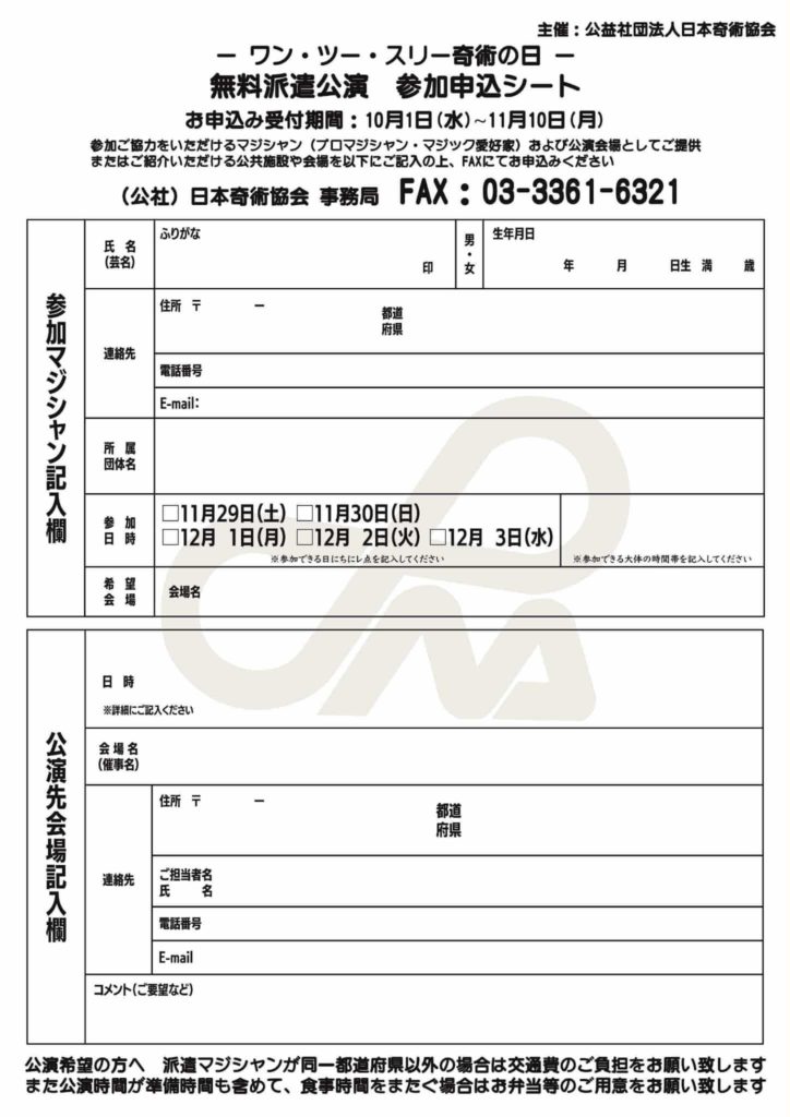 ご応募は申し込み用紙にご記入の上、日本奇術協会までお送りください。多数のご応募をお待ちいたしております。(なお、地域によっては応募数に制限がありますので多数の場合はご容赦ください。)